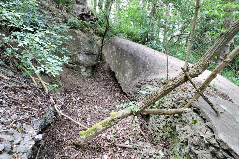 Als erstes fällt einem ein großes Trümmerstück auf, das vom Eingangsbereich (d.h. der feindabgewandten Seite) stammen dürfte: